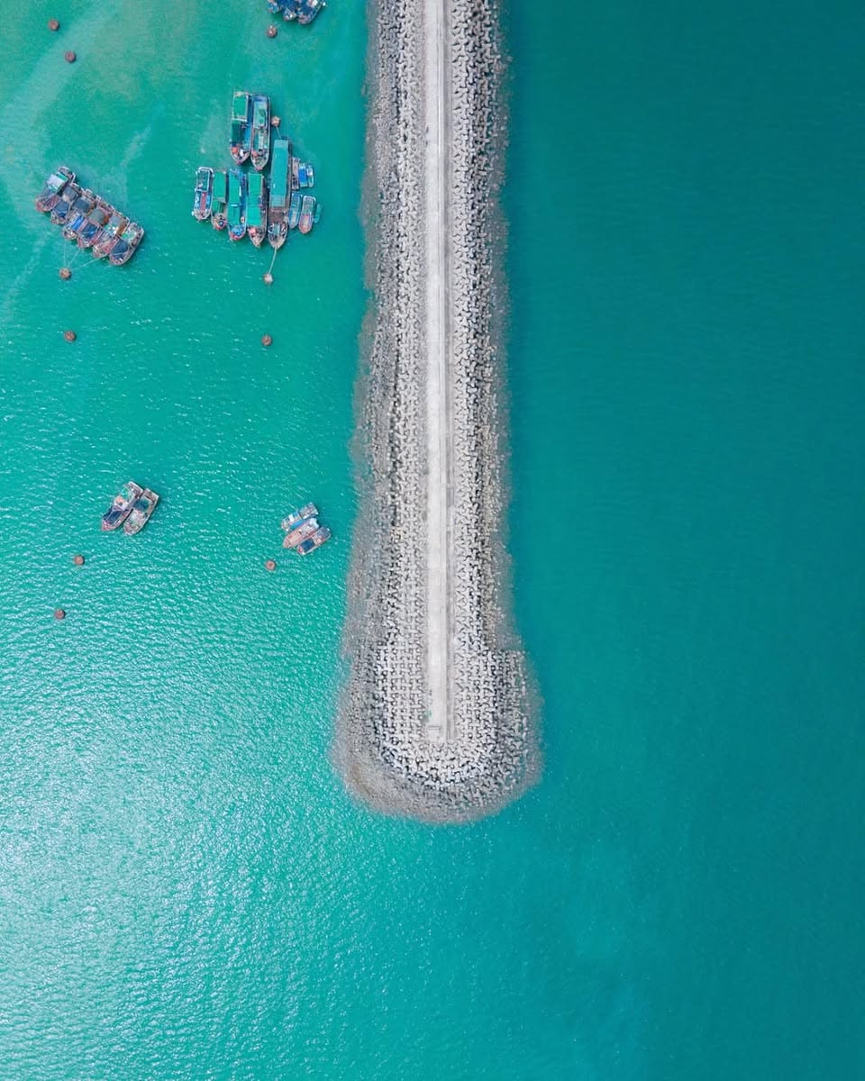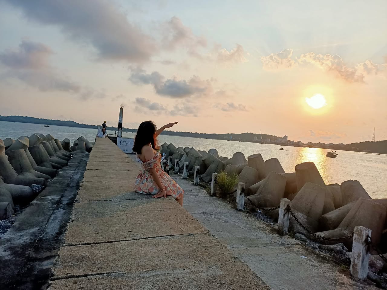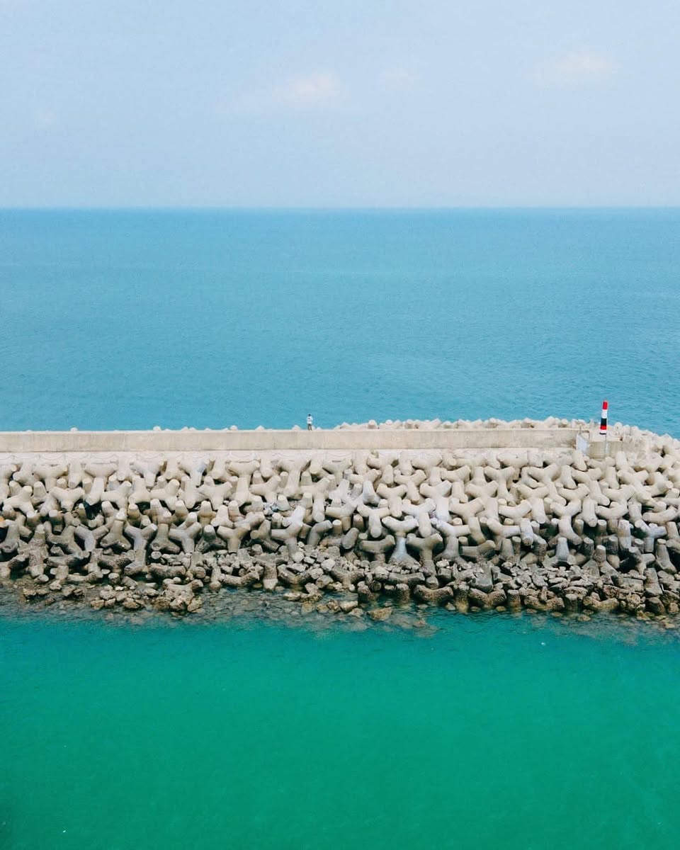 Âu cảng được thiết kế như một lòng chảo hướng biển, bao quanh bởi những dãy trụ bê tông chắn sóng đồ sộ. Những khối bê tông ấy xếp nối nhau kéo dài từ đất liền ra biển, tạo thành một con đường độc đáo, vừa vững chãi như thành lũy giữa đại dương, vừa mềm mại như cánh tay vươn dài đón gió. Vào những ngày trời trong, đứng trên mỏm chắn sóng, du khách có thể phóng tầm mắt ra xa, ngắm nhìn mặt biển bao la, rặng núi xanh mờ phía đất liền và từng đợt tàu thuyền ra vào nhộn nhịp nơi cửa cảng. Khi hoàng hôn buông xuống, mặt trời đỏ rực khuất dần sau hàng trụ sóng, tạo nên bức tranh thiên nhiên hùng vĩ và lãng mạn – một khoảnh khắc khiến bao người lưu luyến mãi không quên.