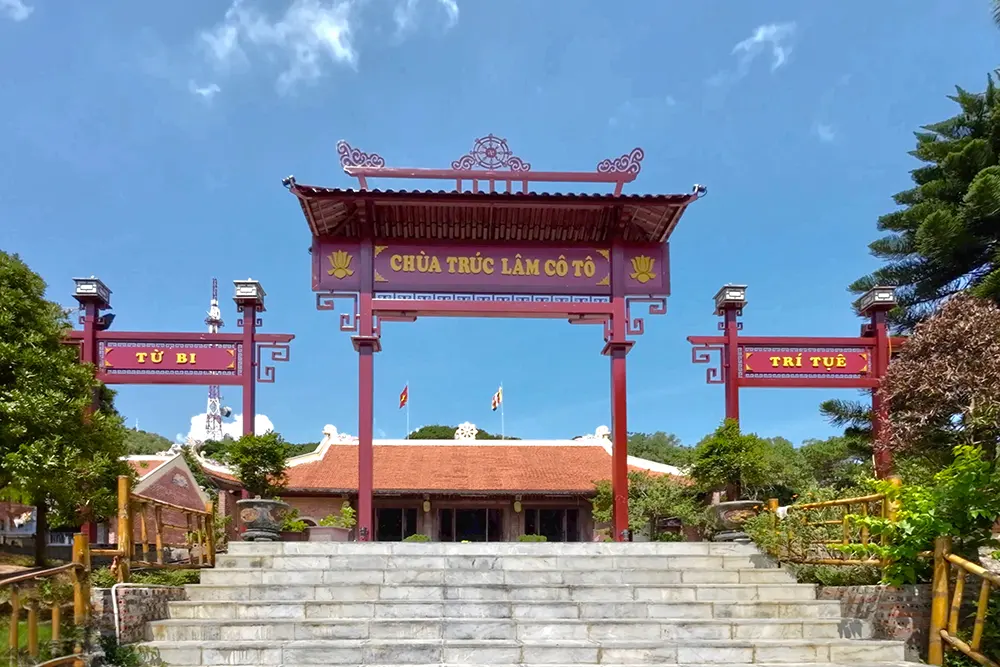 Chùa Trúc Lâm Cô Tô, tên chùa được đặt theo tên của hệ thống Phật giáo Trúc Lâm do Đức vua – Phật hoàng Trần Nhân Tông sáng lập. Chùa có tổng diện tích hơn 2, 5 ha chia thành các phân khu như: Khu cổng Tam quan, lầu chuông, lầu khánh, tòa Tam Bảo, nhà thờ tổ, nhà tăng, nhà thờ mẫu, nhà khách và khuôn viên cảnh quan.